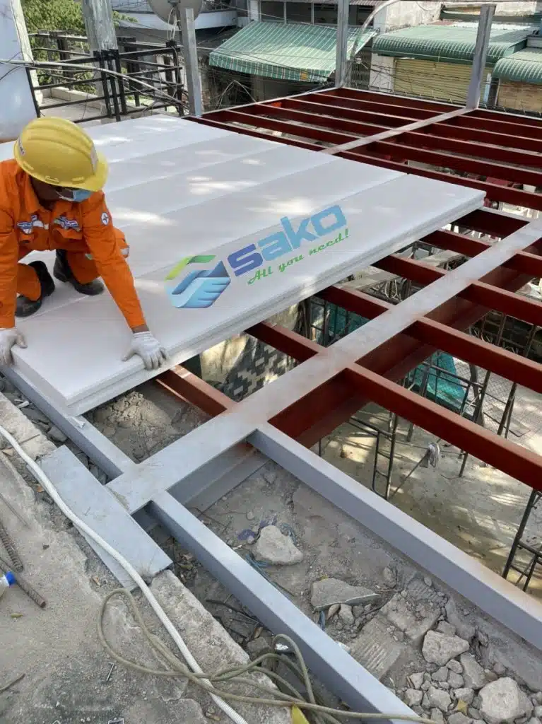 Tấm bê tông nhẹ đúc sẵn làm sàn không hề rung lắc cực kỳ êm lắp ghép xong có thể dán trực tiếp gạch men hoặc ván sàn SPC bề mặt tấm mà không cần phải cán vữa, với ưu điểm là trọng lượng nhẹ và tấm có thể sản xuất theo kích thước thiết kế của công trình lên việc sử dụng tấm bê tông nhẹ đúc sẵn làm vách cực kỳ thuận tiện mà không lo hao hụt vật tư lắp ghép nhanh lắp ghép xong không cần tô chát chỉ cần bả Skimcoat EBS 302, 300 sau đó là sơn trực tiếp lên luôn rút ngắn thời gian thi công tiết kiệm nhân công chi phí cực kỳ lớn